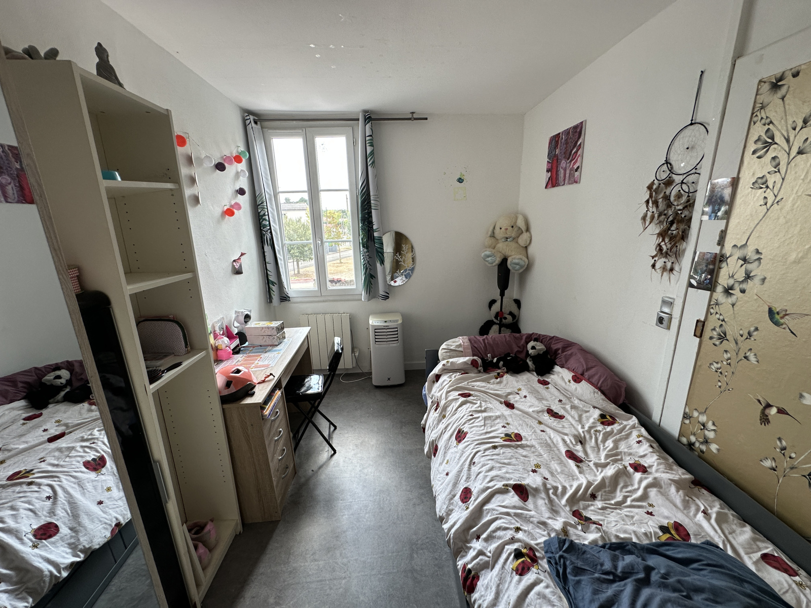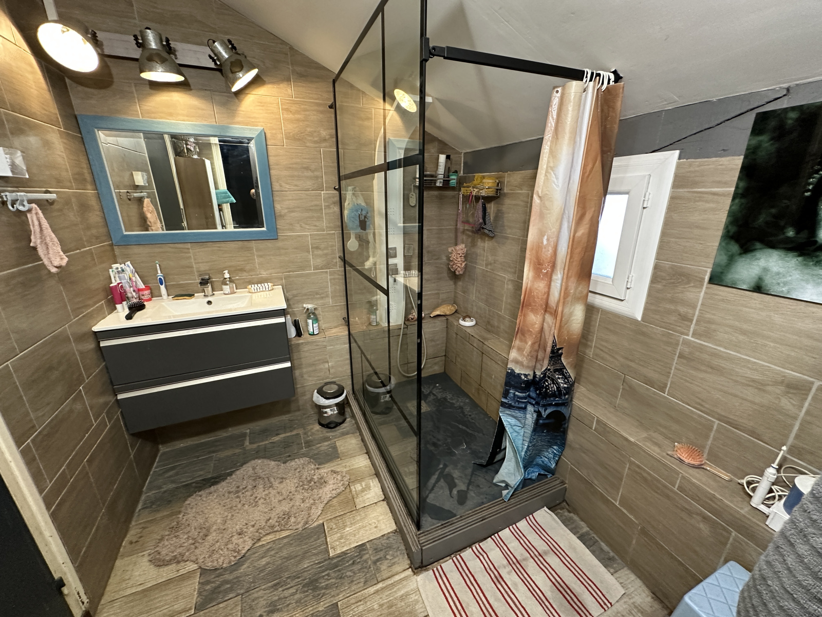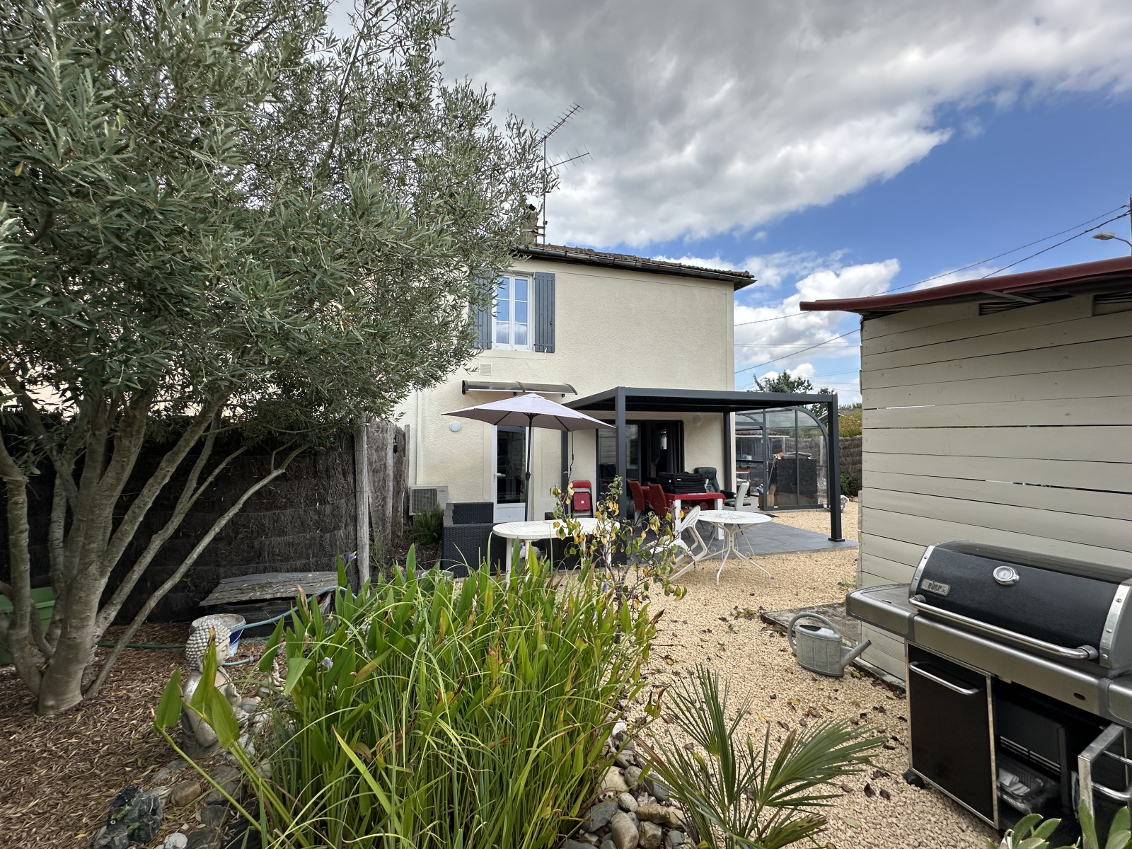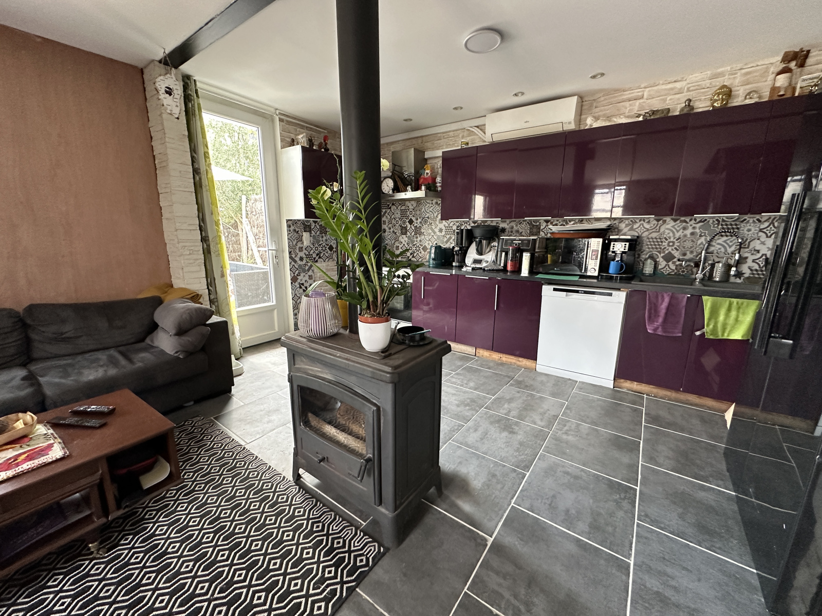 Elle se compose au rez de chaussée d'une entrée permettant l'accès à une pièce à vivre lumineuse avec cuisine équipée, une véranda, une salle d'eau, buanderie, wc, cellier ainsi qu'une chambre et à l'étage 2 chambres supplémentaires.