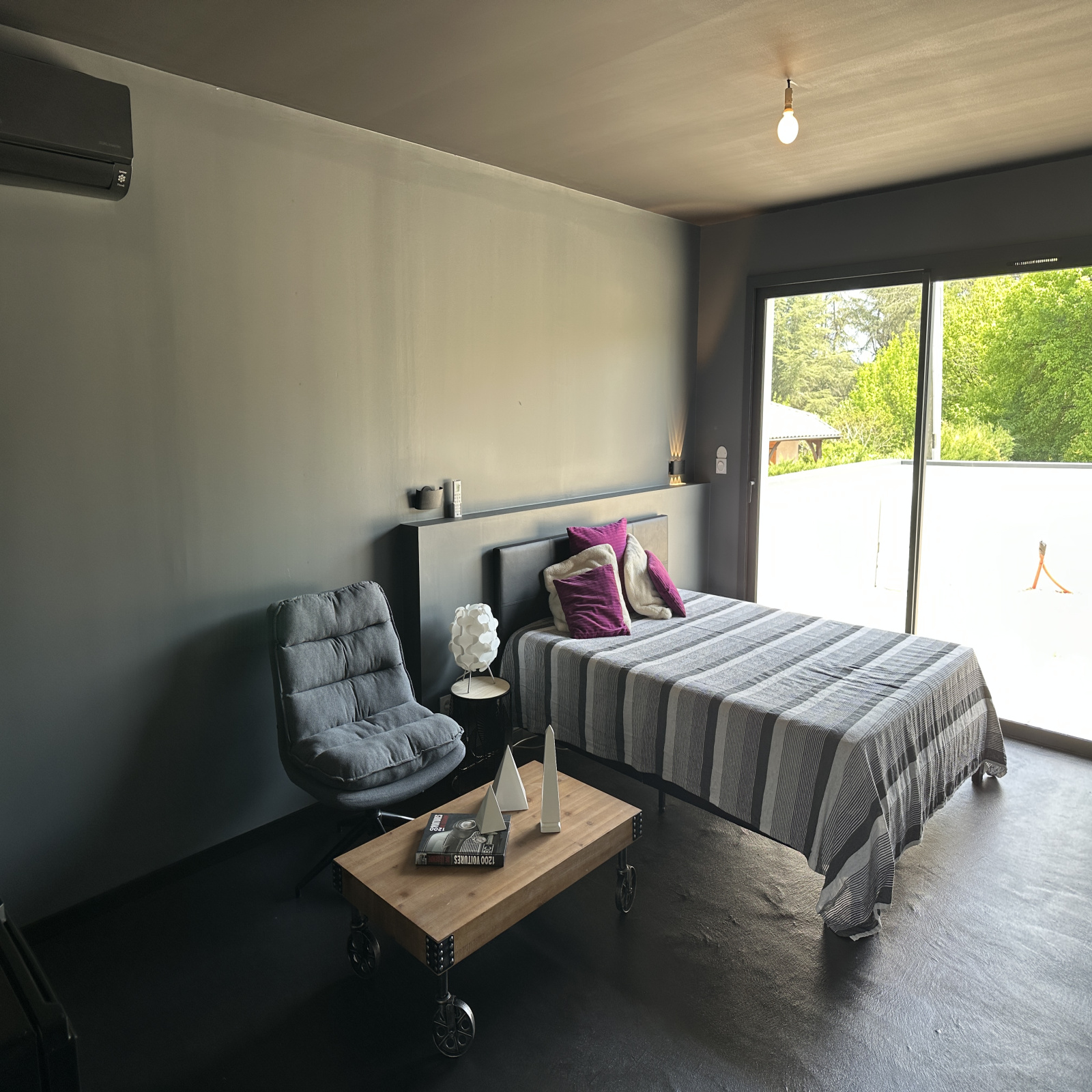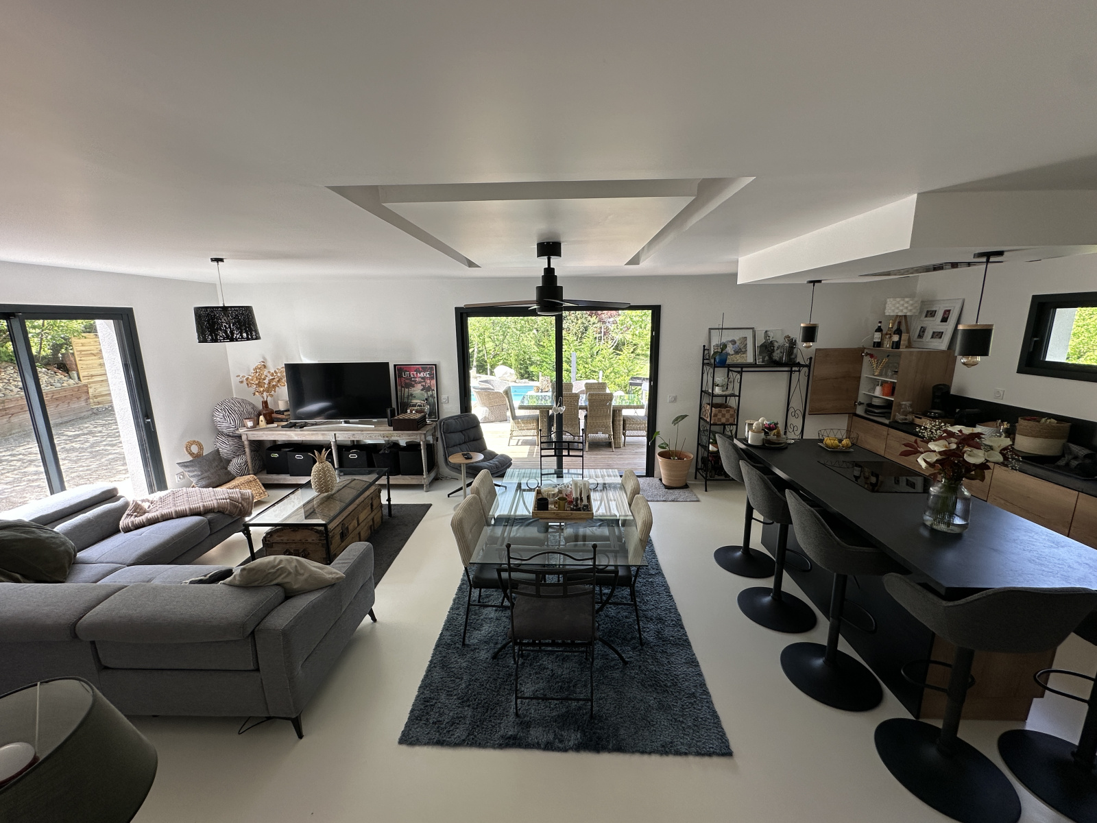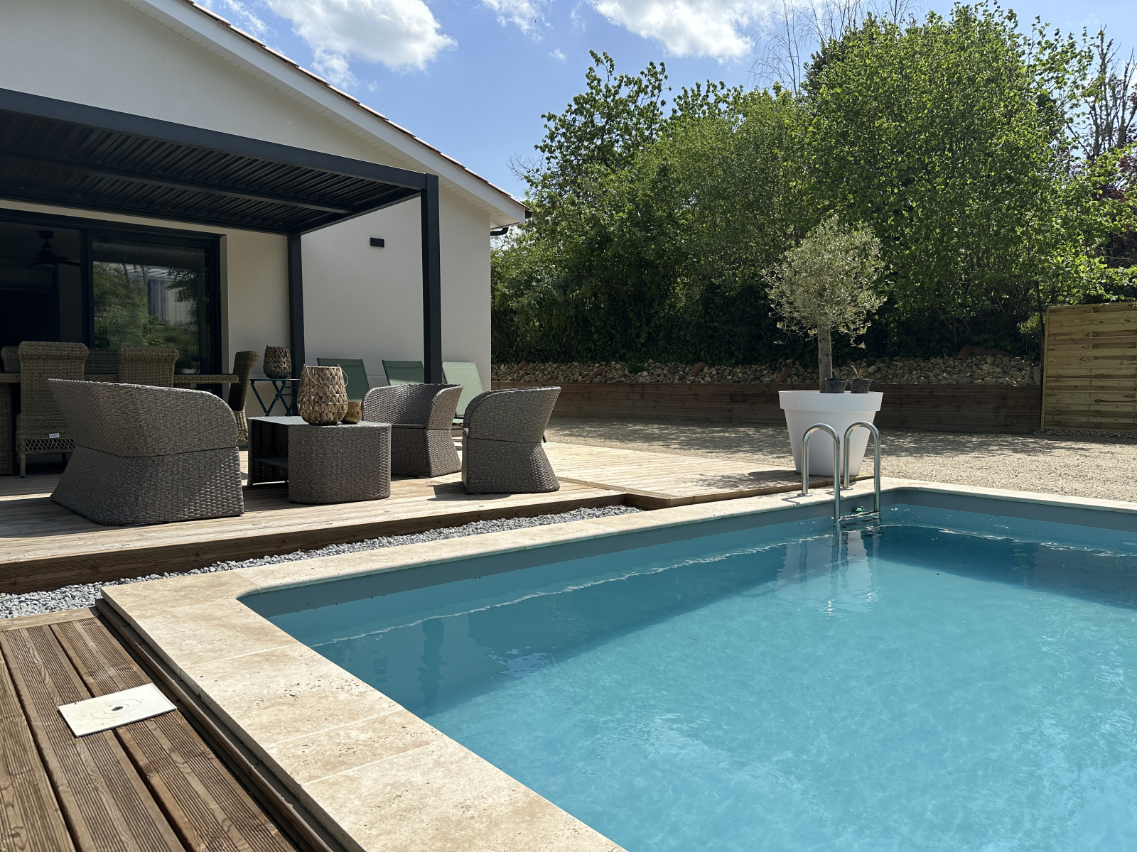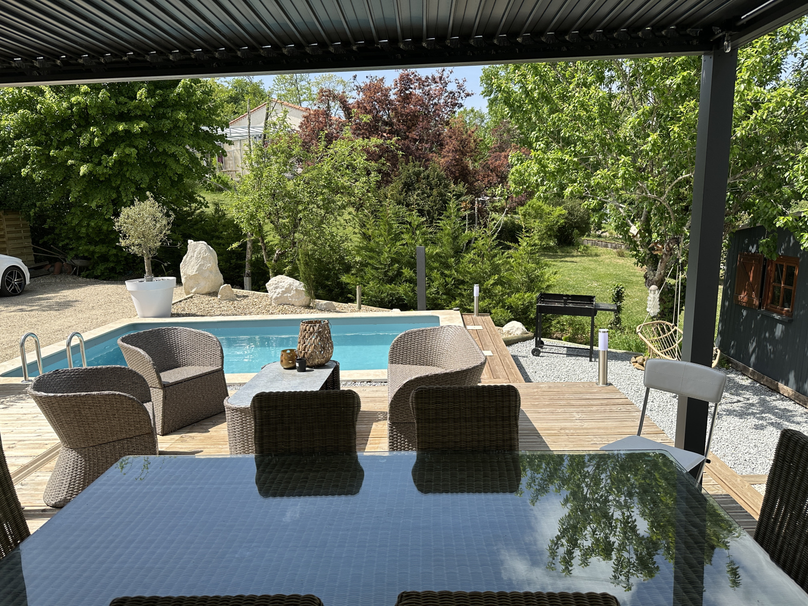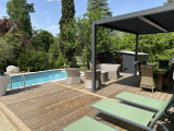 Coté extérieur nous retrouverons une terrasse avec pergola bioclimatique donnant vue sur la piscine et son terrain arboré.