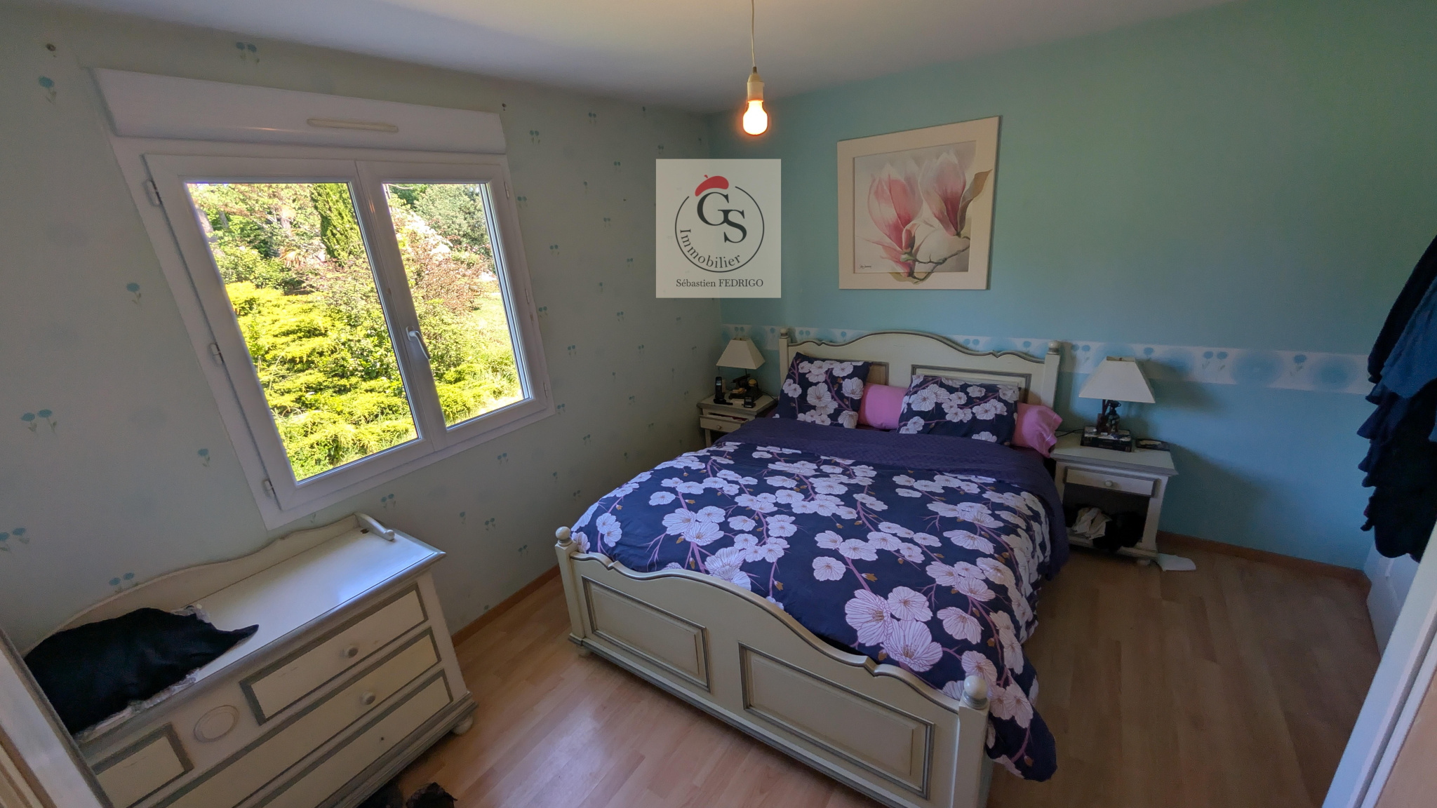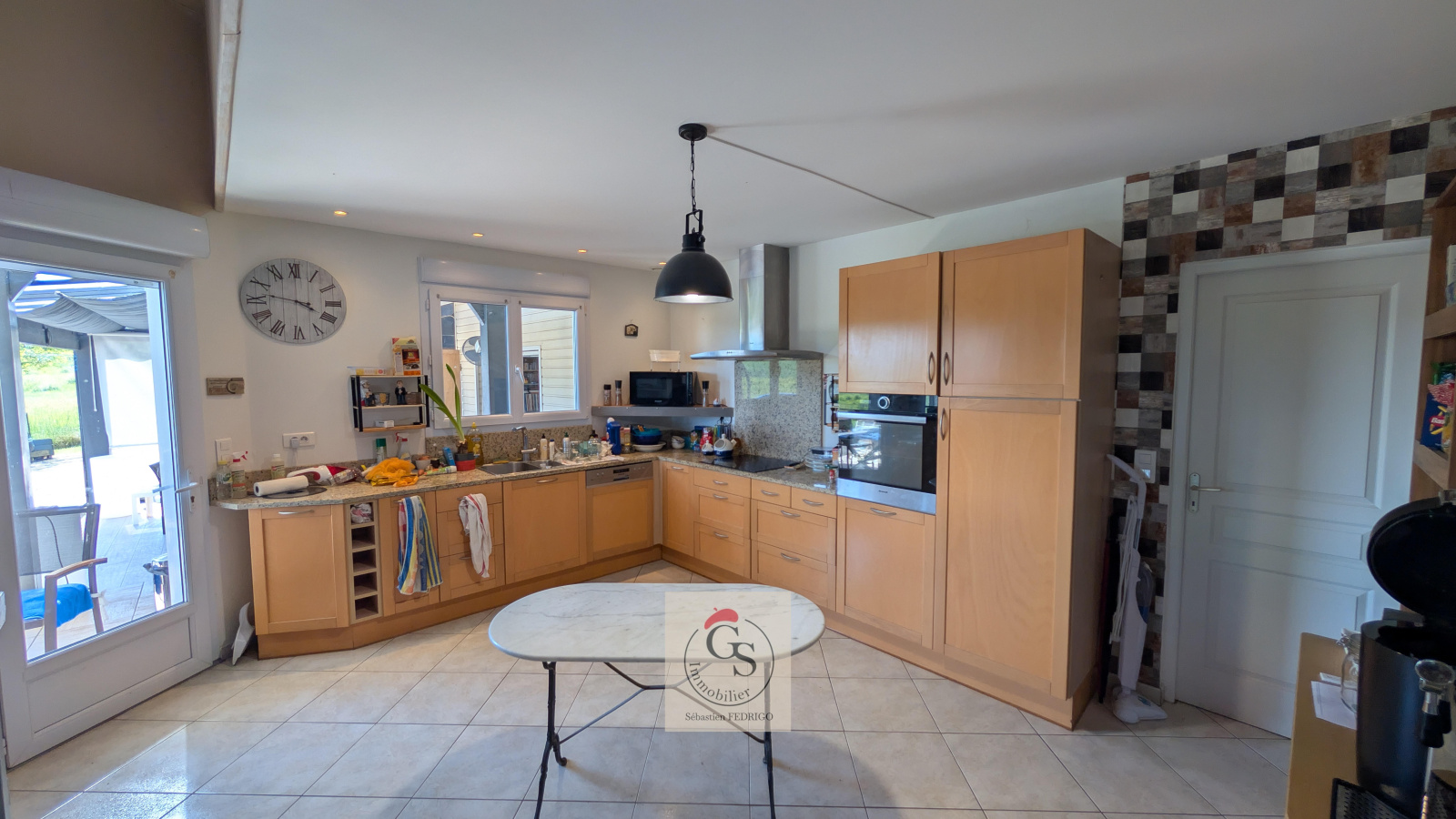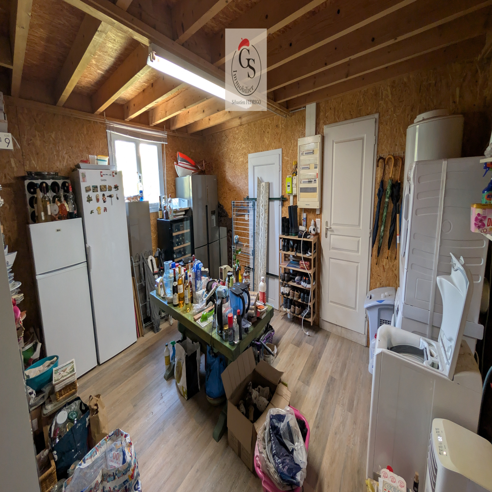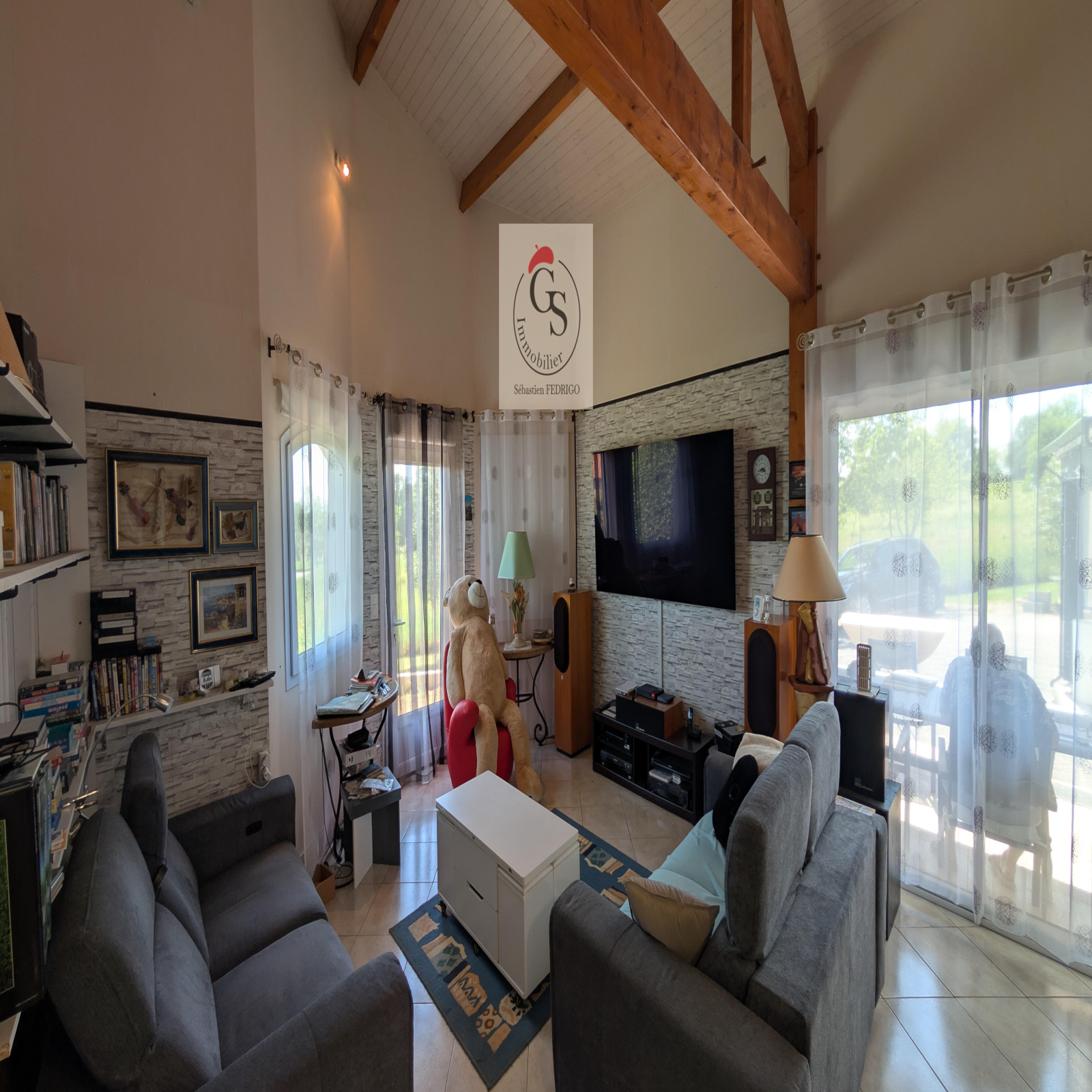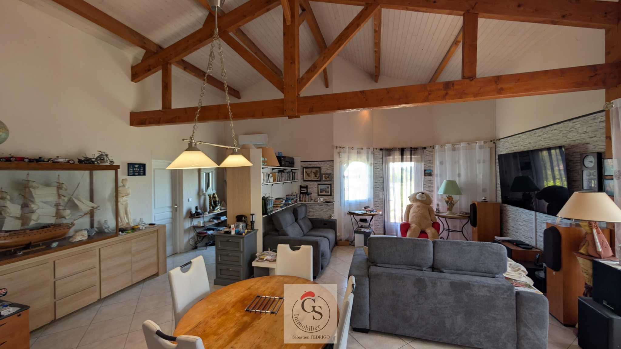 Elle se compose d'une grande pièce de vie très lumineuse avec ferme apparente et plafond cathédrale, d'une cuisine ouverte équipée, d'un cellier et d'une buanderie, de 3 chambres avec placards, d'une salle d'eau et d'un wc indépendant.